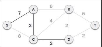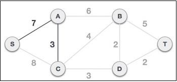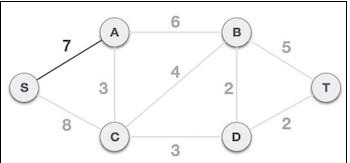 2. 檢查輸出邊並選擇成本較低的邊:選擇根節點 S 後,我們看到 S,A 和 S,C 是兩條權重分別為 7 和 8 的邊。我們選擇邊 S,A,因為它小於另一條邊。