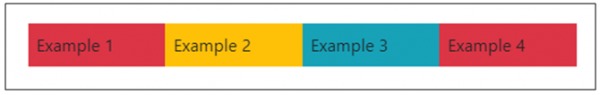 <!DOCTYPE html> <html lang="en"> <head> <title>Bootstrap Example</title> <meta charset="utf-8"> <meta name="viewport" content="width=device-width, initial-scale=1"> <link rel="stylesheet" href="https://maxcdn.bootstrapcdn.com/bootstrap/4.1.0/css/bootstrap.min.css"> <script src="https://ajax.googleapis.com/ajax/libs/jquery/3.3.1/jquery.min.js"></script> <script src="https://maxcdn.bootstrapcdn.com/bootstrap/4.1.0/js/bootstrap.min.js"></script> </head> <body> <div class="container mt-3"> <p>With flex-fill</p> <div class="d-flex mb-3 bg-primary"> <div class="p-2 flex-fill bg-danger">Example 1</div> <div class="p-2 flex-fill bg-warning">Example 2</div> <div class="p-2 flex-fill bg-info">Example 3</div> <div class="p-2 flex-fill bg-danger">Example 4</div> </div> <p>Without .flex-fill:</p> <div class="d-flex mb-3 bg-secondary"> <div class="p-2 bg-danger">Example 1</div> <div class="p-2 bg-warning">Example 2</div> <div class="p-2 bg-info">Example 3</div> <div class="p-2 bg-warning">Example 4</div> </div> </div> </body> </html>