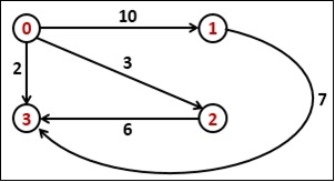 Input: The cost matrix of the graph. 0 10 3 2 ∞ 0 ∞ 7 ∞ ∞ 0 6 ∞ ∞ ∞ 0 Output: Weight of the shortest path is 9