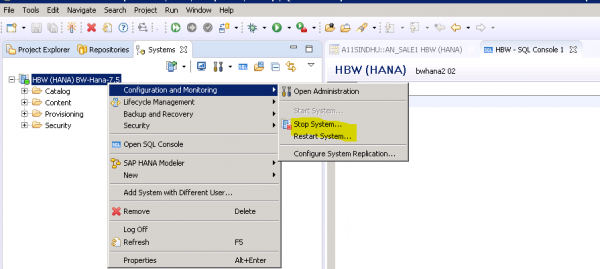 在 SAP HANA studio 中,你可以啟動/停止 SAP HANA 系統。在具有多租戶資料庫容器的系統中,將會啟動所有租戶資料庫,但會停止單個停止的租戶資料庫。若要執行啟動/停止,右鍵單擊 HANA 系統 → 配置和監控 → 停止系統…
