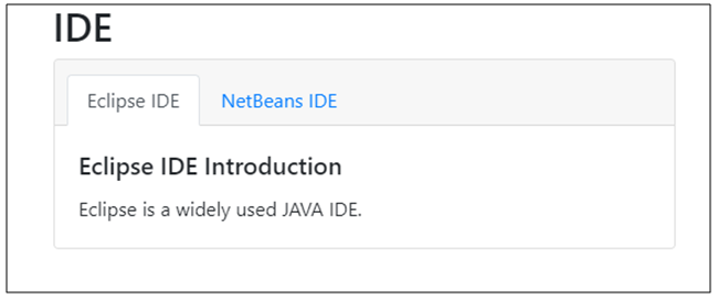 <!DOCTYPE html> <html lang="en"> <head> <title>Bootstrap Example</title> <meta charset="utf-8"> <meta name="viewport" content="width=device-width, initial-scale=1"> <link rel="stylesheet" href="https://maxcdn.bootstrapcdn.com/bootstrap/4.1.0/css/bootstrap.min.css"> <script src="https://ajax.googleapis.com/ajax/libs/jquery/3.3.1/jquery.min.js"></script> <script src="https://maxcdn.bootstrapcdn.com/bootstrap/4.1.0/js/bootstrap.min.js"></script> </head> <body> <div class="container"> <h2>IDE</h2> <div class="card"> <div class="card-header"> <ul class="nav nav-tabs card-header-tabs"> <li class="nav-item"> <a class="nav-link active" href="#">Eclipse IDE</a> </li> <li class="nav-item"> <a class="nav-link" href="#">NetBeans IDE</a> </li> </ul> </div> <div class="card-body"> <h5 class="card-title">Eclipse IDE Introduction</h5> <p class="card-text">Eclipse is a widely used Java IDE.</p> </div> </div> </div> </body> </html>