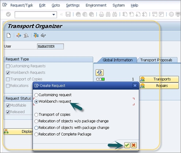 在下一個視窗中,您必須輸入傳輸請求號,如下所示。另請注意,您需要在此螢幕中輸入子物件的 TR#,而不是主物件。