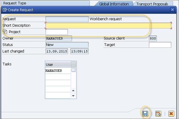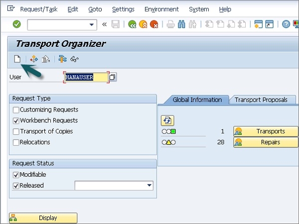 要建立傳輸請求,您必須單擊頂部的“建立”按鈕。這將開啟傳輸組織器,如下所示