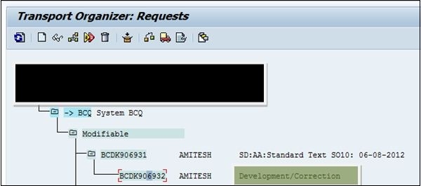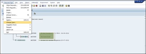您還可以透過導航到頂部的“請求/任務”選項卡來更改傳輸請求狀態。這可以從“未分類”更改為“更正”或“修復”。為此,選擇您的傳輸請求 (BCDK906932),然後單擊主選單上的“請求/任務” -> “更改型別”,然後選擇“更正”。
