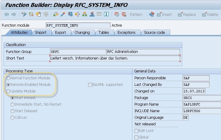 此外,請注意,您的 SAP 函式模組必須“啟用遠端呼叫”,這可以使用 T-Code:SE37 來完成。