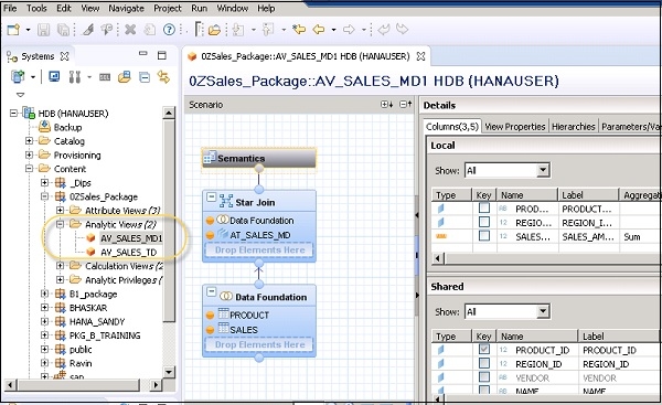 您說得對。在 SAP HANA 中,分析檢視用於實現星形模式查詢,其中我們將一個事實表連線到多個維度表。分析檢視利用 SAP HANA 的真正威力透過星形模式的形式連線表並透過執行星形模式查詢來執行
