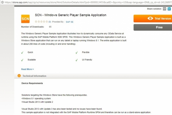 您還可以在 SAP Store 中導航和搜尋 SCN - Windows 通用播放器示例應用程式。“Windows 通用播放器示例應用程式演示瞭如何使用 SAP 移動平臺 SDK SP05 在執行時動態使用任何 OData 服務。此 Windows 通用播放器示例