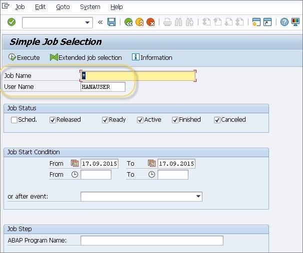 在 SM37 中,您只能看到計劃的後臺作業,因為它不用於前臺作業。以下是 SM37 交易程式碼的初始螢幕