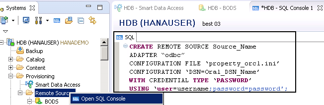 配置檔案“property_orcl.ini”僅適用於 Oracle 資料來源的 Adapter ODBC。以下顯示 SQL 查詢,用於使用 SQL 建立 Oracle 遠端源