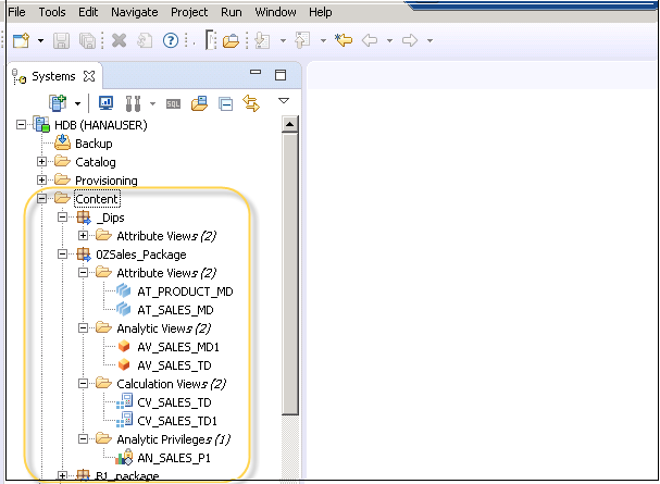 在 SAP HANA 系統中,可以在 HANA 工作室中的“內容”選項卡下列出所有軟體包。所有 HANA 建模物件都儲存在軟體包中。軟體包可用於在 HANA 系統中遷移建模檢視。