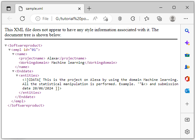 <?xml version="1.0" encoding="UTF-8"?> <Softwareproduct> <empl id="01"> <name> <projectname> Alaxa</projectname> <Workingdomain> Machine learning</Workingdomain> </name> <Enddate> <entities> <![CDATA[This is the project on Alexa by using the domain Machine learning. All the statistical manipulation is performed. Example. '"&<> and submission date 20/06/2024]]> </entities> </Enddate> </empl> </Softwareproduct>
