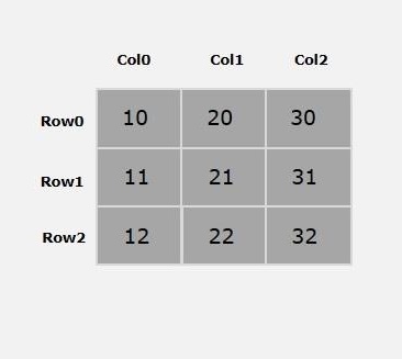 2D 陣列− 在 Java 中,二維陣列表示為同一型別的一維陣列的陣列。通常,它用於表示具有行和列的值表 −