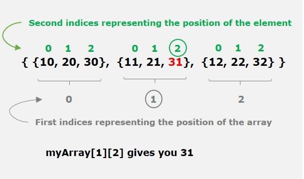 簡而言之,二維陣列包含一維元素陣列。它由兩個索引表示,其中第一個索引表示陣列的位置,第二個索引表示該特定陣列中元素的位置 −