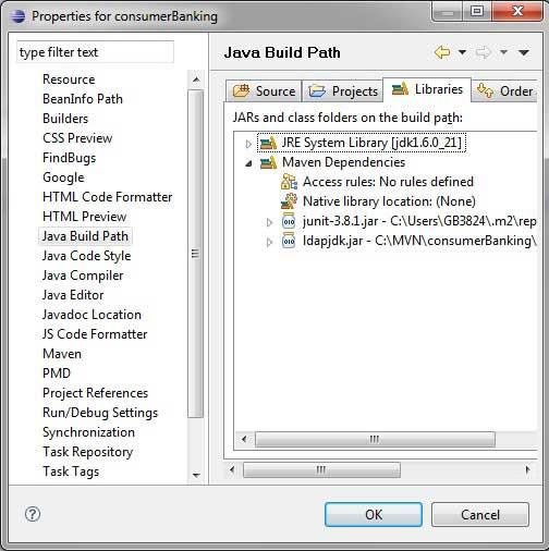 現在,讓我們看看消費者銀行專案屬性。您可以看到 Eclipse 已將 Maven 依賴項新增到 Java 構建路徑。