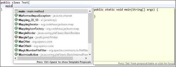 要在 Eclipse 中插入 public static void main(String[] args) 程式碼行無需鍵入整個程式碼行,你可以鍵入 main 然後按 Ctrl + 空格鍵,這時候會出現主方法選項,選擇它即可。