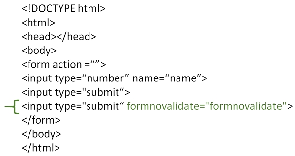 <!DOCTYPE html> <html> <head> <title>HTML formnovalidate attribute</title> </head> <body> <form action = "" method = "get"> Rank <input type="number" name="rank"><br> <input type="submit" value="Submit"><br> <input type="submit" formnovalidate="formnovalidate" value="Submit with no validation”> </form> </body> </html>