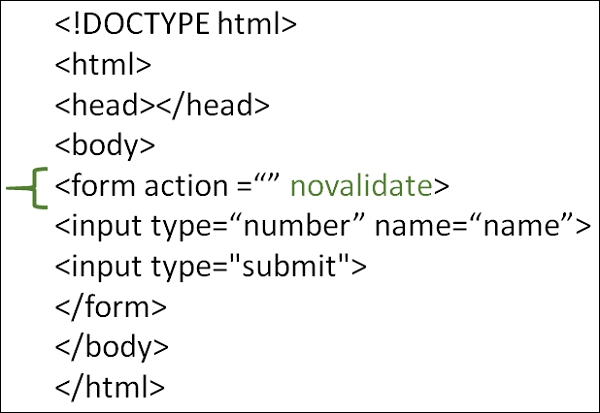 <!DOCTYPE html> <html> <head> <title>HTML novalidate attribute</title> </head> <body> <form action = "" method = "get" novalidate> Team Name<br><input type = "name" name = "tname"><br> Team Rank<br><input type = "number" name = "trank"><br> <input type = "submit" value = "Submit"> </form> </body> </html>