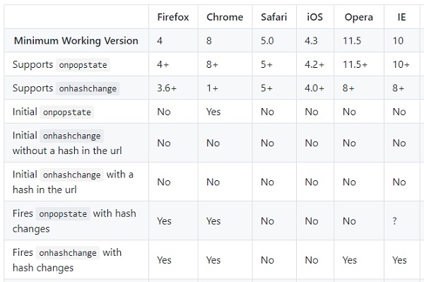 基於 WebKit 的瀏覽器和 Firefox 4 主要支援 HTML5 歷史 API。然而,現在幾乎所有現代瀏覽器都支援它。