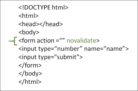 <!DOCTYPE html> <html> <head> <title>HTML novalidate attribute</title> </head> <body> <form action = "" method = "get" novalidate> Student Name<br><input type="name" name="sname"><br> Total Marks<br><input type="number" name="mark"><br> <input type="submit" value="Submit"> </form> </body> </html>