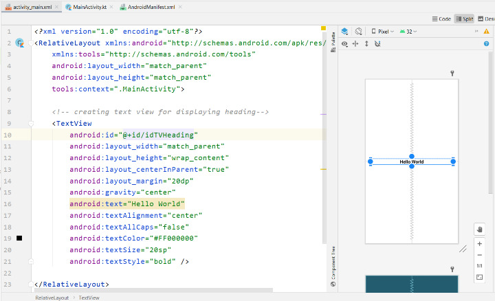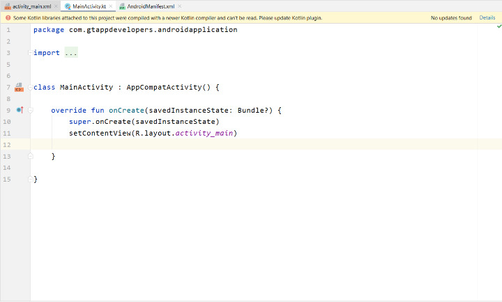 在上面的螢幕中,我們可以看到我們的 Kotlin 檔案。此檔案位於我們的 app>java>應用程式包名中。在此檔案中,我們必須編寫我們將用於在 Android 應用程式中執行某些操作的業務邏輯。在此檔案中,我們可以為在 xml 檔案中建立的檢視新增點選監聽器,或者我們可以將資料設定為我們的檢視。我們必須在 onCreate 方法中為不同的檢視新增操作。