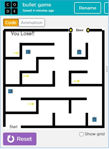 玩家必須透過按向上、向下、向左和向右箭頭鍵來移動突擊隊員,並使突擊隊員逃離圍牆區域。要走出門口,突擊隊員需要找到正確的鑰匙。其中一把鑰匙是門的鑰匙。鑰匙放置在保護區內。突擊隊員需要在拾取正確的鑰匙的同時到達門口。圍牆區域內有很多燃油坦克。如果突擊隊員在這些坦克的射程內,子彈就會被髮射,突擊隊員可能會死亡。但是突擊隊員有一個盾牌,可以透過按“s”鍵來啟動,可以保護突擊隊員免受子彈的傷害。但是,盾牌只能持續很短的時間。玩家的挑戰是讓突擊隊員走出門口,保護士兵免受子彈傷害,並贏得這場遊戲。遊戲非常簡單,具有所需遊戲設計的所有功能。它巧妙地結合了技巧和隨機性。它既不太容易也不太難玩。即時反饋會以視覺方式顯示在螢幕上。一旦子彈擊中突擊隊員,玩家就會輸掉遊戲,並且可以重新開始遊戲。