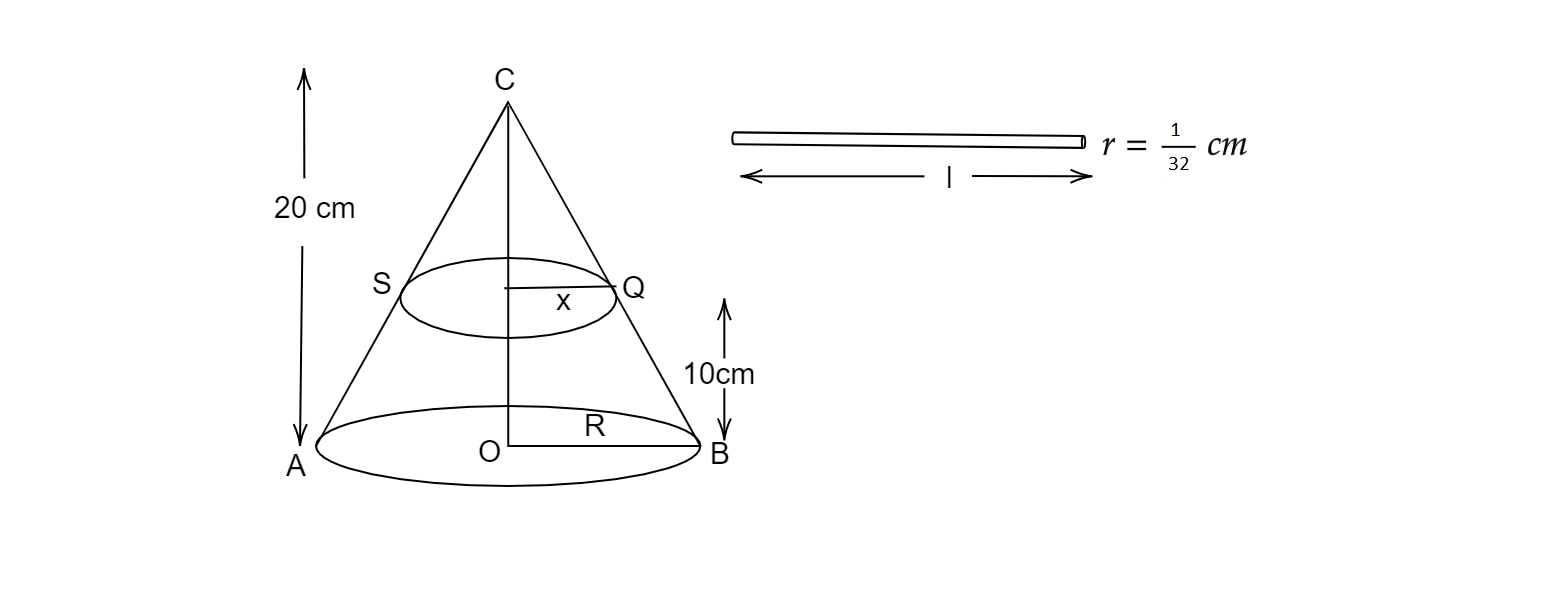 $\Rightarrow V=\frac{1}{3} \pi \left(\left(\frac{20}{\sqrt{3}}\right)^{2} .20-\left(\frac{10}{\sqrt{3}}\right)^{2} .10\right)$