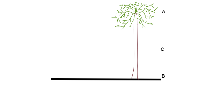 設 $ACB$ 表示樹在斷裂點 $C$ 處斷裂前的狀態,設樹頂 $A$ 在斷裂後落到地面上的點為 $A'$。