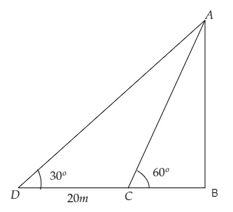$\mathrm{CD}=20 \mathrm{~m}, \angle \mathrm{ADB}=30^{\circ}, \angle \mathrm{ACB}=60^{\circ}$