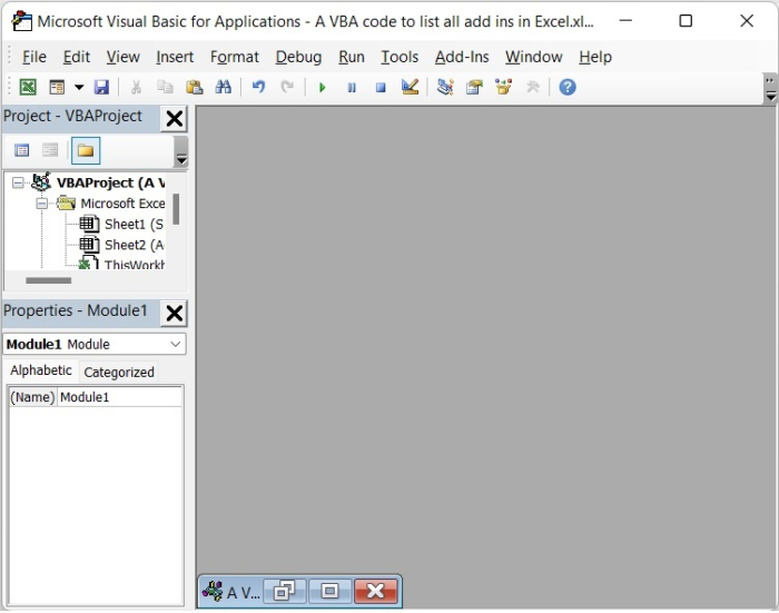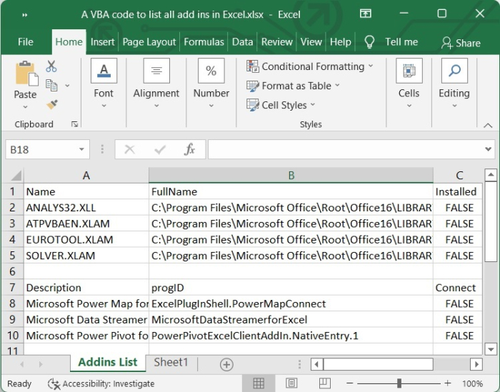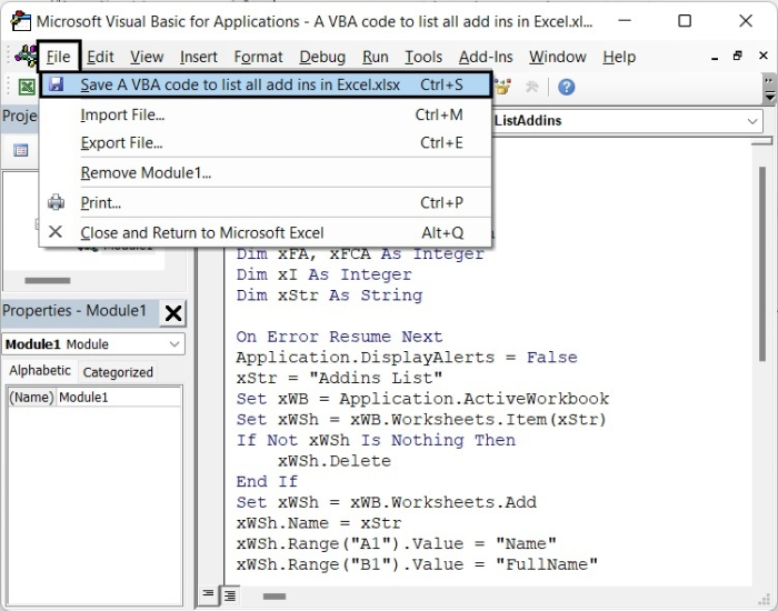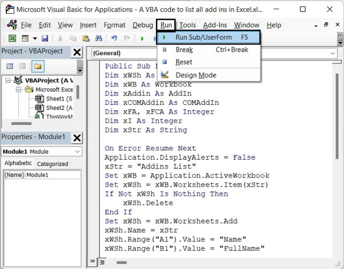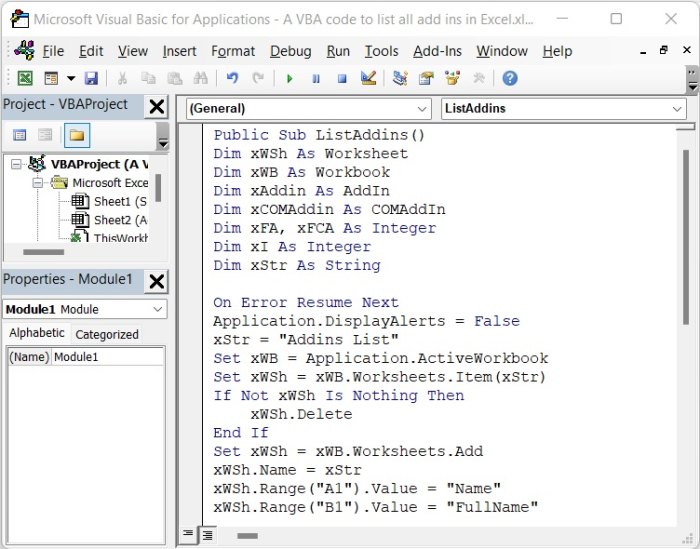 我們可以透過 VBA 程式碼列出 Excel 表格中的所有載入項。因此,讓我們在本教程中瞭解 VBA 程式碼及其工作原理。