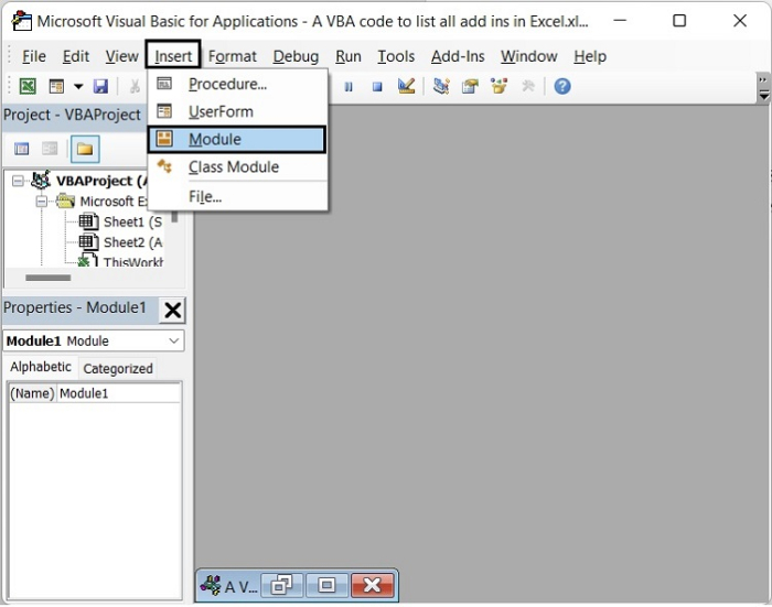 之後,從選單欄中選擇插入 > 模組以調出彈出模組視窗。請參見下圖。