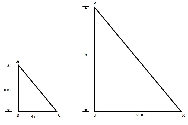 一根長6米的豎直杆子在地面上投下4米長的影子,同時,一座塔投下28米長的影子。求塔的高度。