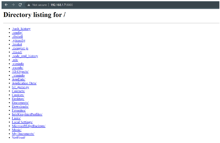 如果裝置的 IP 地址為 192.168.1.7,並且 HTTP 伺服器在埠 8080 上執行,則可以透過在 Web 瀏覽器中輸入 http://192.168.1.7:8000/ 來訪問裝置的檔案,這將在 HTML 頁面檢視中開啟裝置的當前檔案目錄。您可以透過點選網頁上的目錄名稱來訪問任何子目錄。
