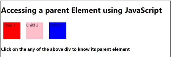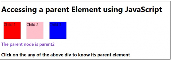 <!DOCTYPE html> <html lang="en"> <head> <meta charset="UTF-8" /> <meta name="viewport" content="width=device-width, initial-scale=1.0" /> <title>Document</title> <style> body { font-family: "Segoe UI", Tahoma, Geneva, Verdana, sans-serif; } .result { font-size: 18px; font-weight: 500; color: #8a2be2; } .parent1, .parent2, .parent3 { display: inline-block; margin: 10px; } .child1, .child2, .child3 { width: 70px; height: 70px; } .child1 { background-color: red; } .child2 { background-color: pink; } .child3 { background-color: blue; } </style> </head> <body> <h1>Accessing a parent Element using JavaScript</h1> <div class="parent1"> <div class="child1">Child 1</div> </div> <div class="parent2"> <div class="child2">Child 2</div> </div> <div class="parent3"> <div class="child3">Child 3</div> </div> <br /> <div class="result"></div> <h3>Click on the any of the above div to know its parent element</h3> <script> let resEle = document.querySelector(".result"); document.querySelector(".child3").addEventListener("click", (event) => { resEle.innerHTML = "The parent node is " + event.target.parentNode.className; }); document.querySelector(".child1").addEventListener("click", (event) => { resEle.innerHTML = "The parent node is " + event.target.parentNode.className; }); document.querySelector(".child2").addEventListener("click", (event) => { resEle.innerHTML = "The parent node is " + event.target.parentNode.className; }); </script> </body> </html>