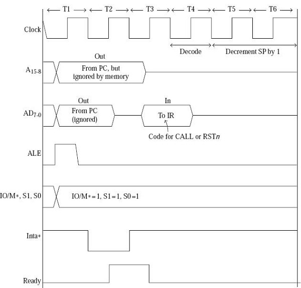 8085 透過在機器週期 INA 的 T2 狀態啟用 INTA* 引腳來確認輸入輸出埠的中斷,其中 INTA* 是處於活動低狀態的引腳。