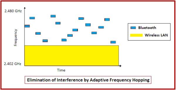 藍牙通訊網路容易受到訊號干擾,尤其是在其他無線網路共存的環境中。當它們使用相同的頻段時,問題會加劇。藍牙技術和 IEEE 802.11 網路(如無線區域網 (WLAN) 和 WiFi)在相同的 2.4 GHz ISM(工業、科學和醫療)免許可無線電頻段中執行。為了減少這些干擾的影響,藍牙特別興趣小組 (SIG) 引入自適應頻率跳變 (AFH)。