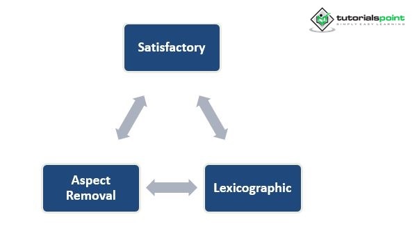 第一個是滿意策略,其中第一個產品被評估為滿足所有選定屬性的閾值,即使該產品不是最好的。這些策略中的第二個,方面移除策略,為最重要的屬性設定閾值,並允許滿足此閾值的所有競爭產品達到以下屬性及其閾值。第三種策略,詞典式策略,評估最重要的屬性。如果一個產品優於其他產品,則停止決策過程並選擇該產品;否則,它將繼續下一個最重要的屬性。