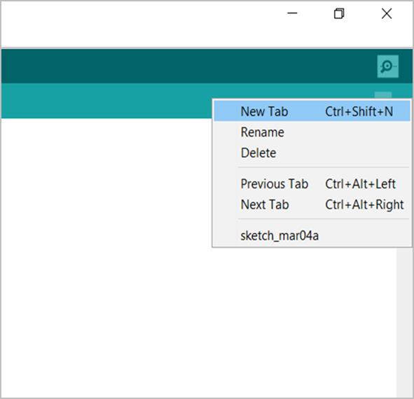 你可以在 Arduino IDE 中透過單擊螢幕右上角的向下箭頭並選擇“新建標籤頁”來建立檔案。(或者,你可以按鍵盤上的 Ctrl+Shift+N)