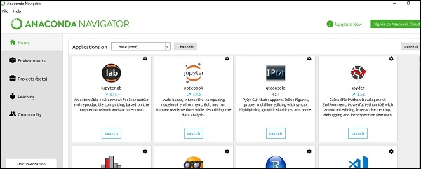 方法 1 − 一種常見的方法是使用“Anaconda Navigator”將包新增到我們的 Anaconda 環境中。開啟“Ananconda Navigator”後,主頁將如下所示: