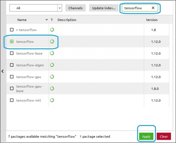 透過 Anaconda Navigator 安裝任何包都非常容易,只需搜尋所需的包,選擇包,然後單擊“Apply”進行安裝即可。假設您的計算機上未安裝 tensorflow 包,我可以簡單地搜尋所需的包(如 tensorflow),選擇它,然後單擊“Apply”進行安裝。