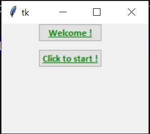 from tkinter import * from tkinter.ttk import * canv = Tk() canv.geometry('200x150') #Create style object sto = Style() #configure style sto.configure('TButton', font= ('calibri', 10, 'bold', 'underline'), foreground='Green') # button 1 btns = Button(canv, text='Welcome !', style='TButton', command=canv.destroy) btns.grid(row=0, column=1, padx=50) # button 2 btnns = Button(canv, text='Click to start !', command=None) btnns.grid(row=1, column=1, pady=10, padx=50) canv.mainloop()