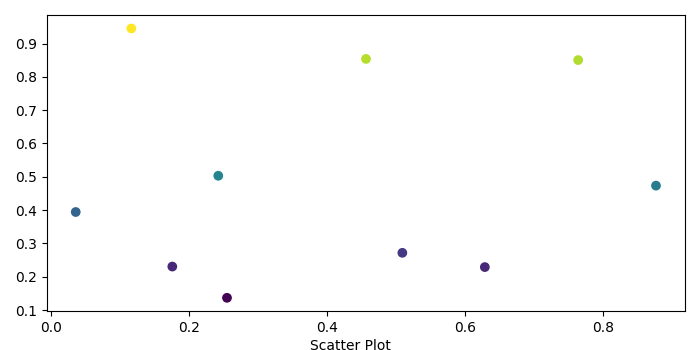 import numpy as np from matplotlib import pyplot as plt plt.rcParams["figure.figsize"] = [7.00, 3.50] plt.rcParams["figure.autolayout"] = True x = np.random.rand(10) y = np.random.rand(10) fig = plt.figure() plt.scatter(x, y, c=y) fig.text(.5, .0001, "Scatter Plot", ha='center') plt.tight_layout() plt.show()