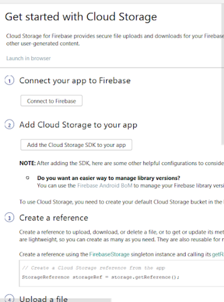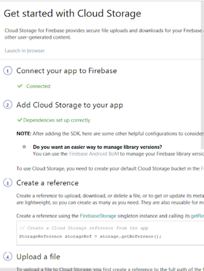 之後,您只需單擊“連線到 Firebase”即可將您的應用程式連線到 Firebase。然後,您必須單擊“將雲端儲存新增到 Firebase”以向其新增 Firebase 儲存依賴項。單擊這兩個按鈕後,您將看到以下螢幕。