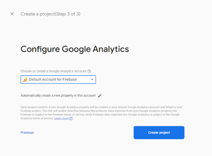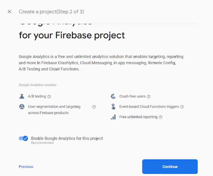 在此螢幕中,啟用專案中的 Google Analytics,然後單擊“繼續”進入下一步。您將看到以下螢幕。