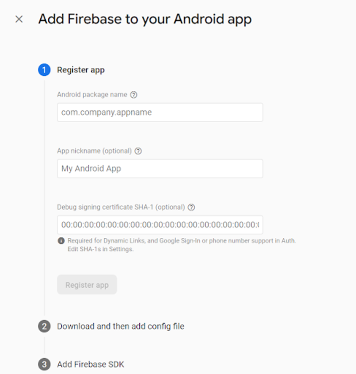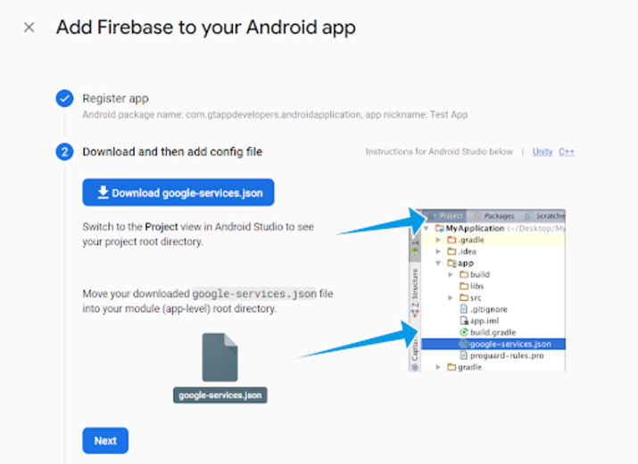 在此螢幕中,只需從您的 Android Studio 專案中指定您的應用程式的 Android 包名。包名可以在應用程式級別的 build.gradle 檔案中找到。您將看到一個名為 applicationId 的標籤,其中包含您的應用程式的包名。複製該包名並將其新增到 Firebase 控制檯中。之後指定應用程式名稱,然後您可以單擊“註冊應用”來註冊您的應用程式。之後您將看到以下螢幕。