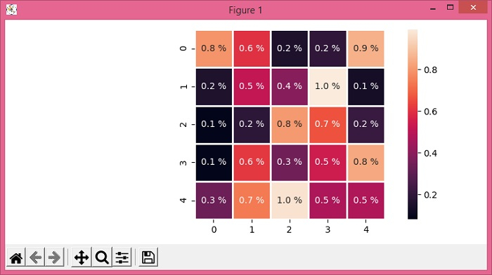 import matplotlib.pyplot as plt import seaborn as sns import numpy as np plt.rcParams["figure.figsize"] = [7.50, 3.50] plt.rcParams["figure.autolayout"] = True data = np.random.rand(5, 5) ax = sns.heatmap(data, annot=True, fmt='.1f', square=1, linewidth=1.) for t in ax.texts: t.set_text(t.get_text() + " %") plt.show()