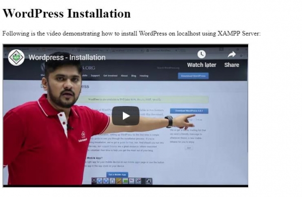 <!DOCTYPE html> <html> <head> <title>Learn WordPress</title> </head> <body> <h1>WordPress Installation</h1> <p>Following is the video demonstrating how to install WordPress on localhost using XAMPP Server:</p> <iframe height="350" width="600" src="https://www.youtube.com/embed/F6m0ghjadlw"> </iframe> </body> </html>