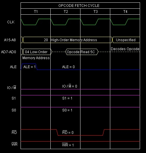 **總結** - 所以這條指令 **MOV E, H** 需要 1 個位元組,1 個機器週期(操作碼獲取)和 4 個 T 狀態才能執行,如定時圖所示。