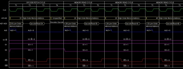 **總結** - 所以這條指令 **LDA 4050H** 需要 3 個位元組,4 個機器週期(操作碼獲取、記憶體讀取、記憶體讀取、記憶體讀取)以及 13 個 T 狀態才能執行,如定時圖所示。