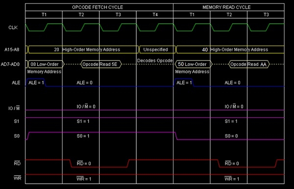 **總結** - 所以這條指令 **MOV E, M** 需要 1 個位元組,2 個機器週期(操作碼獲取、記憶體讀取)以及 7 個 T 狀態才能執行,如定時圖所示。