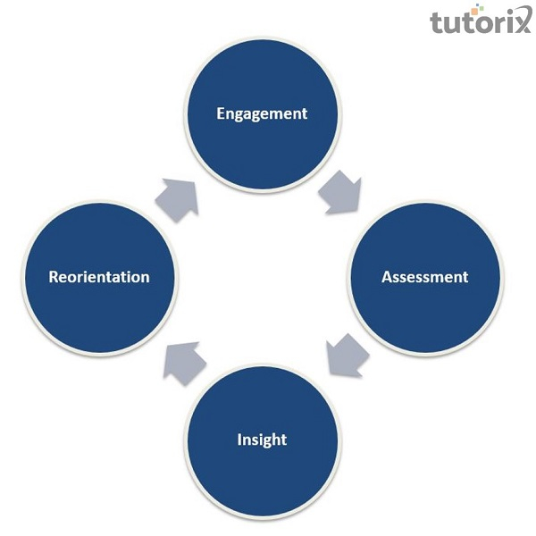 這種療法有一些不同的階段,包括個體和治療師之間的互動。下一個階段是評估階段,治療師將透過一些評估來了解患者先前經歷的歷史。第三階段包括洞察力,它解釋了個體生活中發生的各種事件,並提出一些應對問題的建議。最後一個階段是重新定向,治療師將激勵個體發展一些新的技能、行為和習慣,這將有助於支援他們未來的成長。